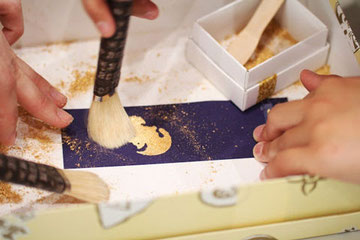 日本の伝統的な絵具の材料をつかって、青色の暑中見舞いをつくろう。はがきの持ち込みもOK。