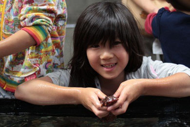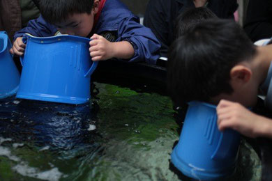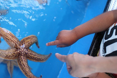 青色の魚が泳ぐ姿を見てみよう! ウニやヒトデ、サメなどを手にとって観察してみよう!