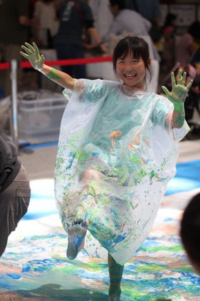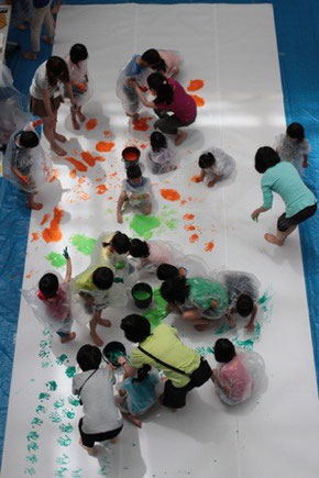 とっても大きな紙に、手や足を使って、みんなで青い絵を描こう!